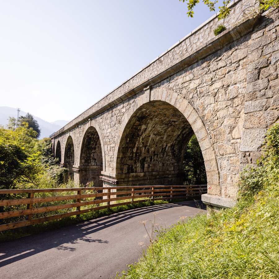 The historic bridge from 1847 at the Windschnur archaeological site, showcasing three eras of road and bridge construction in the Puster Valley.