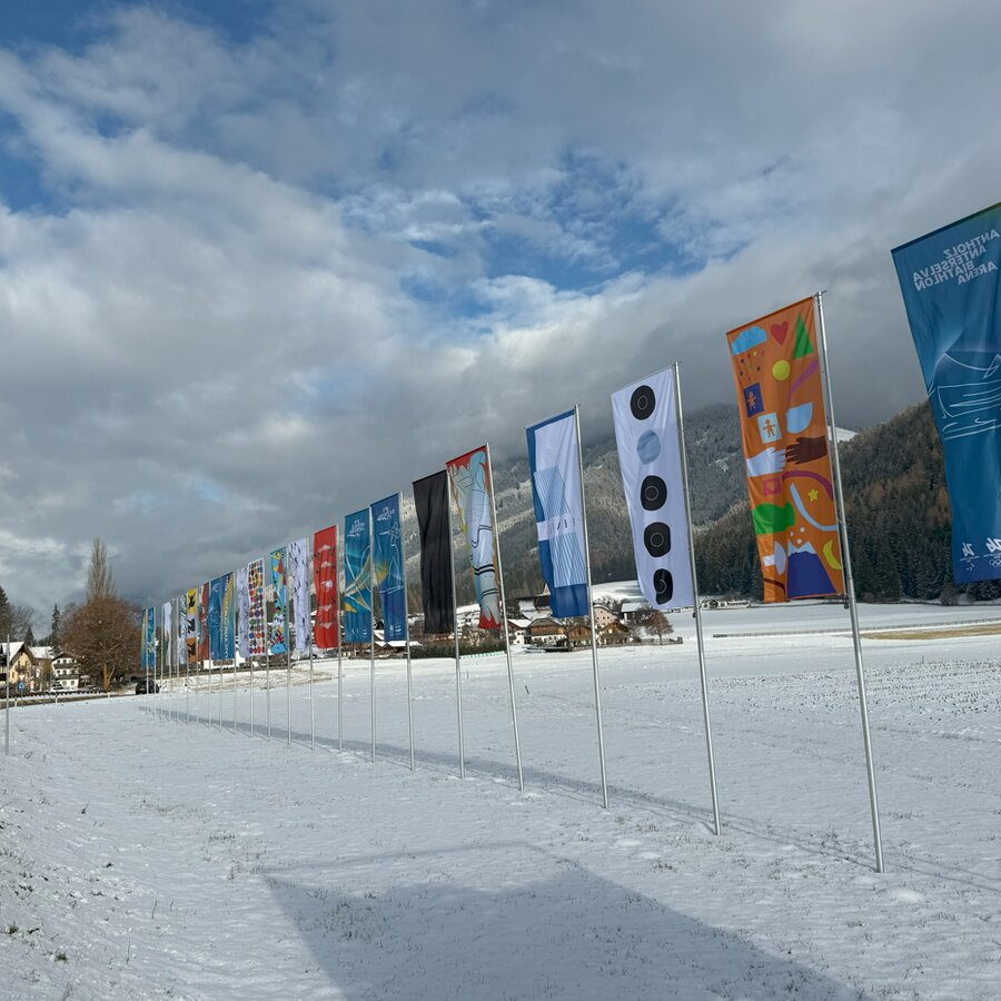 The South Tyrolean Artists’ Association (SKB) and the ECK Museum of Art invited artists to design individual flags. As part of the 2026 Winter Olympic Games, these works are displayed at the entrance to the Antholz Valley.