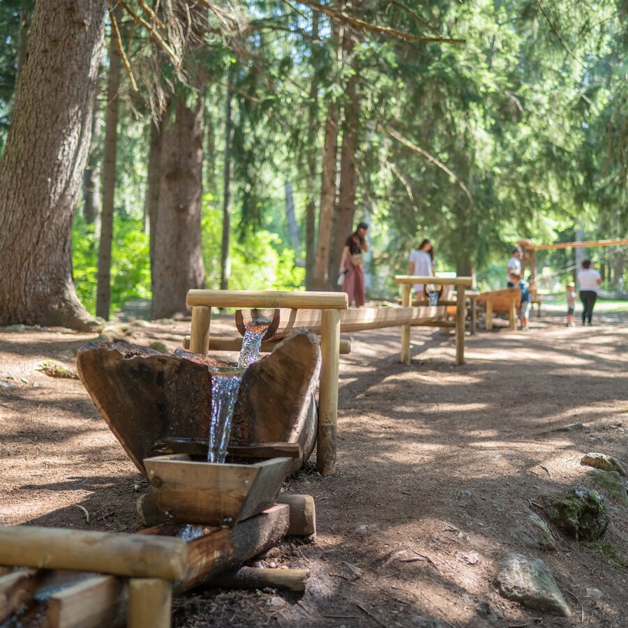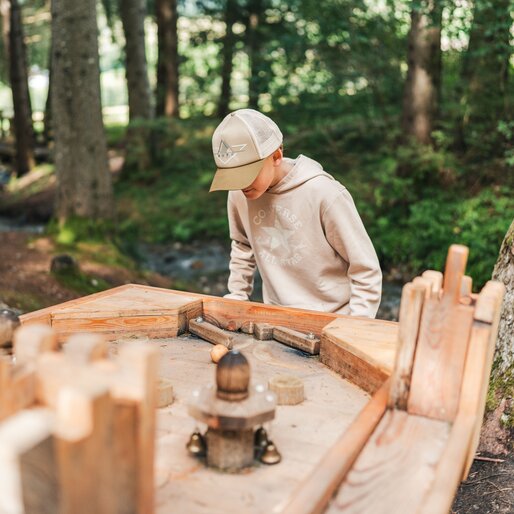 The highlight is the marble water track “Anton’s Journey through the Valley of Water Games”, a nature-based experience stretching across the Antholz Valley. Together with Anton, the cheerful sheep, children guide the wooden ball from station to station: