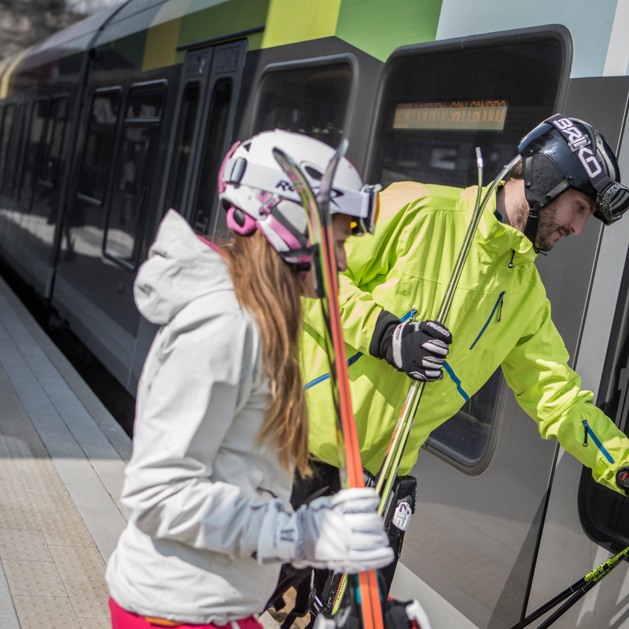 With the connection of the ski lift facilities to the railway network, the possibility exists for all skiing vacationers to do without their own cars when traveling locally and instead to use the Ski Pustertal Express for their daily transfers within the Kronplatz Ski Area. Anyone who gets off in Perca-Percha can climb right into a cabin of the Plan de Corones-Kronplatz Ried circulating cableway. In addition, the connection with the Ski Train makes it possible to commute every thirty minutes between the two ski areas of the Plan de Corones and the Dolomiti di Sesto-Sextener Dolomiten with the railway connection of the Monte Elmo-Helm valley terminal in Versciaco-Vierschach.