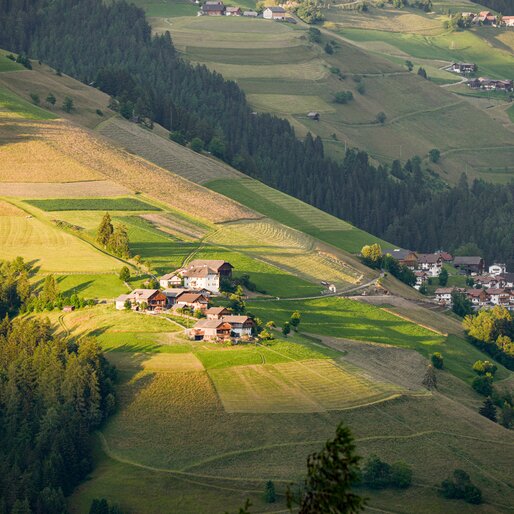 Moving up towards Pieve di Marebbe, the landscape is dotted with historic viles. La Pli (Pieve) itself originated around the parish church with just two farmsteads (masi), forming the nucleus from which the village later developed. Shortly afterwards comes Brach, with four masi and a castle inhabited by the nobles of Prack until 1682. Brach was rebuilt in traditional style after a fire in 1958. Further on lies Pliscia, a village of six masi, known for its church and the old sacristan’s house. Above Pliscia sits Ciaseles, a large vila of seven closely clustered masi: a fire in 1883 destroyed it, and it was rebuilt while preserving its original compact layout. Even higher, at over 1,500 meters, Frontü dominates the valley with its three centuries-old masi; the name of the vila lives on in the surname Frontull, typical of the area.